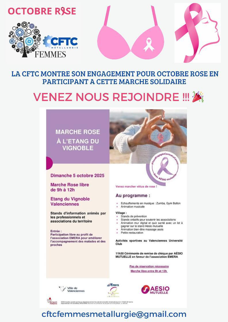 La Commission participe également à des marches / courses partout en France à l'occasion de ce mois. N'hésitez pas à les contacter ! Retrouvez-les sur leur page Facebook Cftc Femmes Métallurgie , ou contactez-les par mail à cftcfemmesmetallurgie@gmail.com